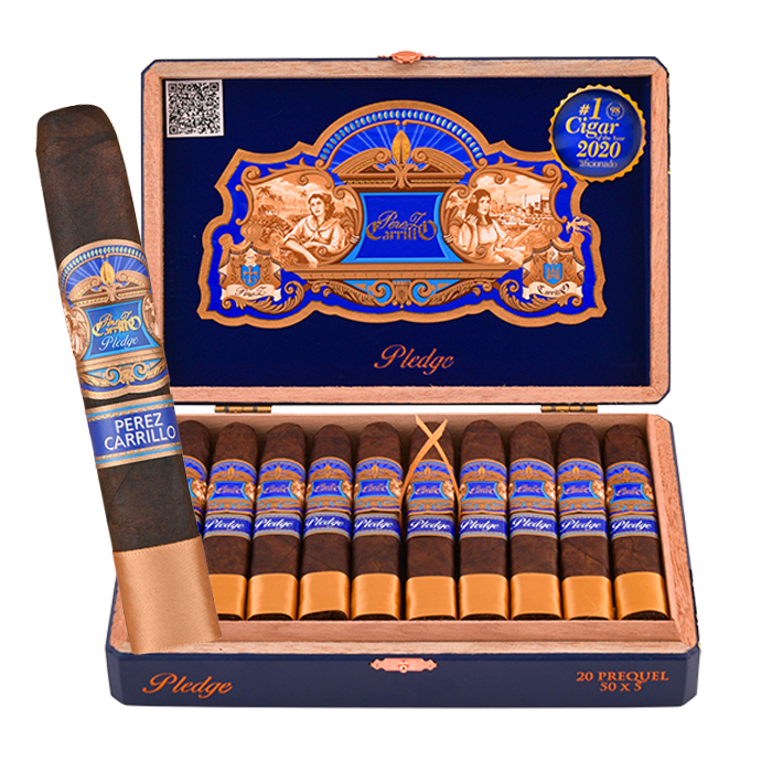 The EP Carrillo Pledge line is a fuller bodied masterpiece made for indulgent palates and hearty appetites.  The cigars are perfectly fermented, balanced and beautifully constructed. The unique USA Connecticut Habano maduro wrapper is spectacular and compliments the Ecuadorian binder and Nicaraguan fillers perfectly.  In 2020 Cigar Aficionado magazine rated the Pledge Prequel a 98 and named it Cigar of the Year.