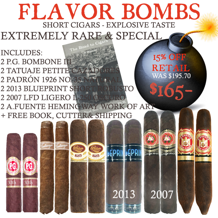 This Flavor Bomb collection is an unprecedented array of rare, aged and extremely flavorful cigars. Some might call these "Dog Walkers", or relatively small cigars perfect for an evening dog walk, but most of these cigars can last at least an hour. They are deceptively big in spirit! The 2013 Blueprint Short Robusto was an experimental blend that never went to market and was just discovered in the recesses of our humidor. The 2007 La Flor Dominicana Ligero Cabinet Oscuro L-250 was in an unopened box until recently and it is majestic and smoking perfectly right now! Every other cigar in this bundle has been aging at least 18 months. This collection of "small" cigars is guaranteed to leave a lasting impression.