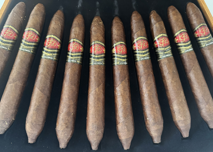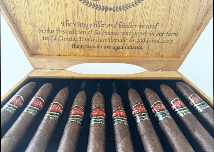 This spectacular La Flor Dominicana Salomon Vitola was rated the #13 cigar of 2009 by Cigar Aficionado Magazine. The vintage fillers and binder used in this cigar are from the 2004 and 2005 La Canela, Dominican Republic harvests. It has been meticulously cared for in our humidors since its creation and aged perfectly. This is truly a unicorn product that you will probably never see again! It is full bodied, elegant, sweet and uniquely flavored - from LFD's golden age of experimental and innovative cigar making.